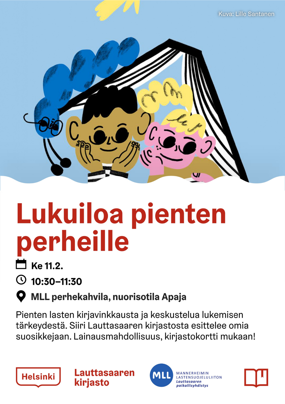 Tule mukaan MLL Lauttasaaren perhekahvilaan nuorisotalo Apajalle keskiviikkona 11.2. klo 10.30-11.30 kuulemaan pienten lasten kirjavinkkejä sekä keskustelemaan lukemisen merkityksestä.